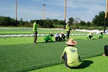 หลังจากหญ้าเทียมส่งถึงสถาณที่แล้ว ทางบริษัทก็ทำการปูหญ้าเทียมทันที พร้อมกับลงInfill ผลงานออกมาเป็นที่น่าพอใจกับเจ้าของสนามมาก หญ้าเทียมรุ่นที่ใช้นี้มีความนุ่ม แต่ทนทาน ผ่านการทดสอบ ได้รับ Fifa 2 star มาแล้ว ใครอยากมาทดสอบรออีกไม่กี่วันครับ